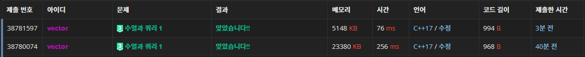 실제 시간도 256ms에서 76ms로 약 30%가 되었고, 메모리 사용량은 25% 정도로 줄었다. 머지 소트 트리는 4N개의 노드가 벡터 하나씩을 저장하므로 메모리를 매우 많이 차지하게 되지만, 펜윅 트리는 N개의 노드가 정수 하나를 저장할 뿐이기에 메모리를 거의 먹지 않는다. 이 문제가 아니더라도 특정 아이디어를 통해 머지 소트 트리 문제를 세그먼트 트리 문제로 만들어 시간 및 메모리를 크게 줄일 수 있다. 제한이 빡빡한 문제를 만나면 써먹을 수 있도록 이 문제에서 연습해두자.