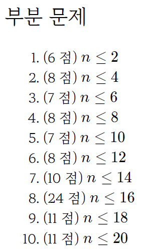 증가하는 부분수열의 개수가 정확히 K개 있는 permutation을 만들면 되는 간단한 문제이다. K<=1e18이고, permutation의 길이가 90 이하면 만점을 준다. 배점표는 아래와 같다.
