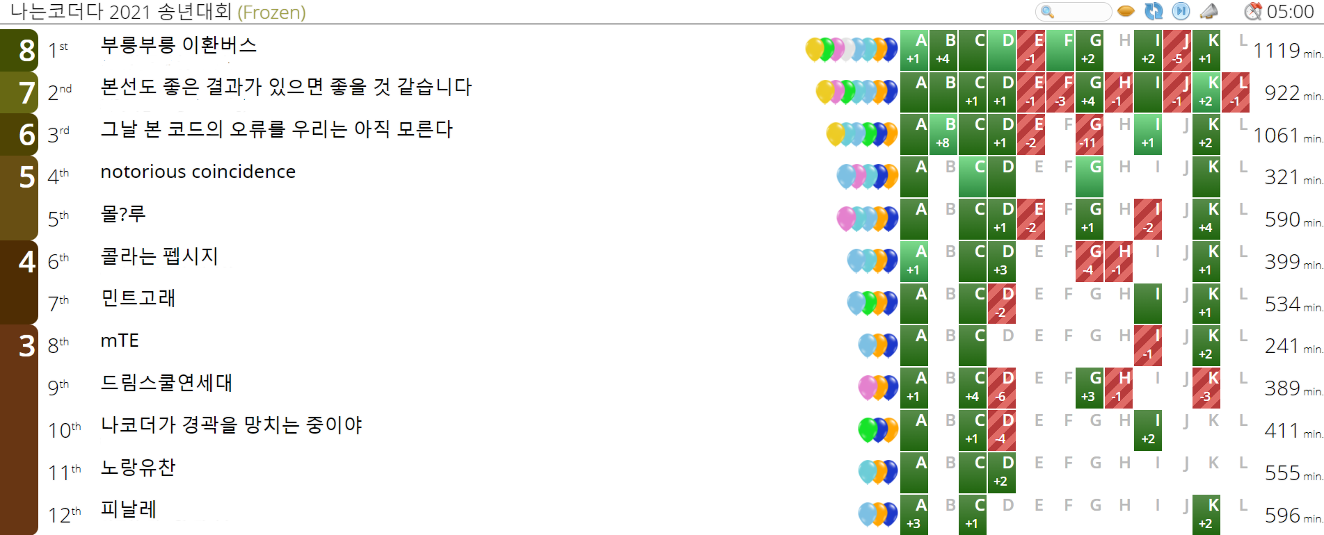 우리 팀은 CF 레드 코더가 ABCD번, 필자가 EFGH번, CF 오렌지 코더가 IJKL번을 관찰하기로 하였다. 초반에 ACD와 IK를 빠르게 풀며 가장 먼저 5솔에 도달했고, 이 중 K번은 퍼솔 타이틀도 얻었다. 쉬운 문제를 가장 잘하는 팀원이 풀어 사소한 시간 페널티를 줄였고, 구현과 수학을 잘하는 팀원이 구현 문제인 I번과 정수론 문제인 K번을 맡아 빠르게 풀었다. 사다리 타기를 통해 맡을 문제를 결정했었는데, 결과적으로 봤을 때 각 팀원의 실력 및 장단점에 맞게 잘 배정된 것 같다.