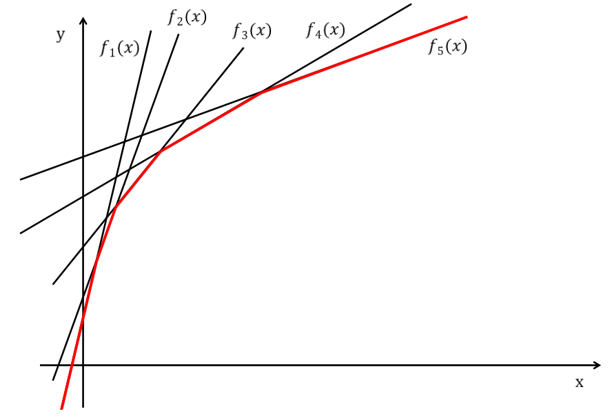 특정 DP 문제에서 다음과 같은 꼴의 식을 접할 수 있다. 보통의 경우, 각 (i, j)에 대해 모두 계산해 최솟값을 찾아줘야하므로 시간복잡도는 O(n^2)이다. 하지만 모든 j에 대해 B[j]>B[j-1]인 경우에는 시간복잡도를 O(nlogn)까지 줄일 수 있고 만약 모든 i에 대해 A[i]j이상인 모든 n에 대해서 A[i]B[j]+C[j]를 계산하는 과정은 f(x)=B[j]x+C[j]라는 고정된 일차함수의 A[i]에 대한 함숫값을 계산하는 과정과 같다는 것이다. j번째 직선을 나타내는 함수를 f_j(x)라고 하자. f_j(x) 들의 기울기인 B[j]가 점점 감소하므로 직선들은 아래와 같이 그려진다. 우리는 각각의 x에 대해 최솟값을 구해주고 싶으므로, 위 그래프에서 빨간 부분만 고려하면 된다. 빨간 ..