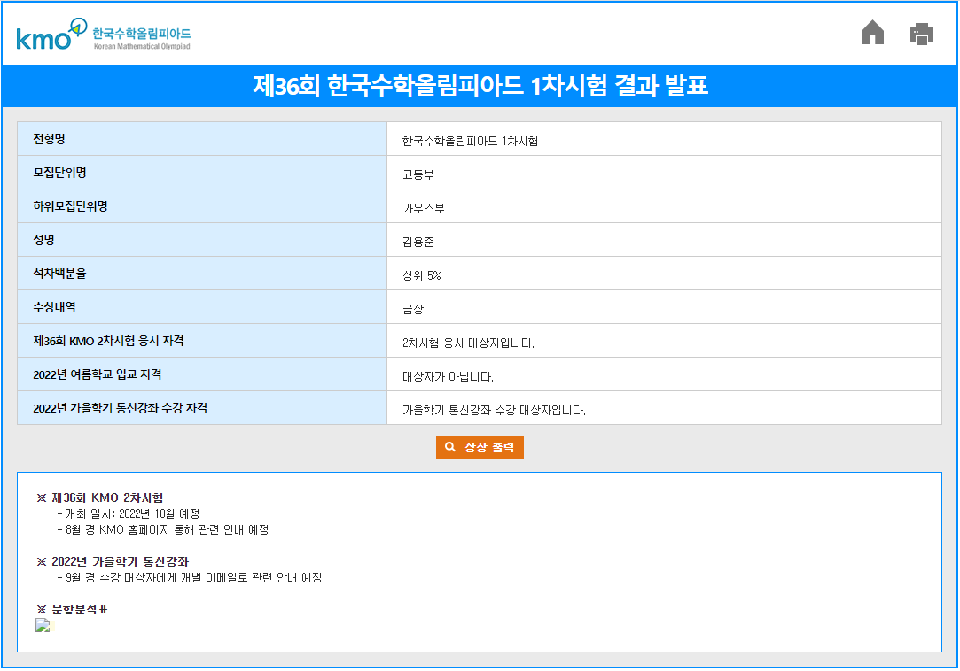 총점 : 1교시 46 + 2교시 40 = 86 (상위 5%, 금상) 1. 문제들이 쉬워서 금컷을 90점대로 예상한다. 2. 계산 실수를 하지 않아서 준비를 안했음에도 점수가 잘 나왔다. 3. 6점은 다 맞혔지만 4점은 하나 틀렸다... unordered_map이 PS하는 블로그 이지만 나는 중학교 때까지 수올러였다. (이 블로그의 첫 글인 소개 글을 보면 알 수 있다.) 3년 동안 수올에 손을 놓고 있다가, 문득 이번이 수올을 볼 마지막 기회라는 걸 깨달았다. 그래서 준비 단 1분도 하지 않고, 오로지 참가에 의의를 두고 마지막 수올을 응시했다. 그렇게 부담 없이 봐서 그런지 계산실수도 하나도 안했고, 점수가 생각보다 잘 나와서 2차에는 갈 것 같다. 상의 색은 7월 4일에 결과가 발표하는 대로 이 글 ..